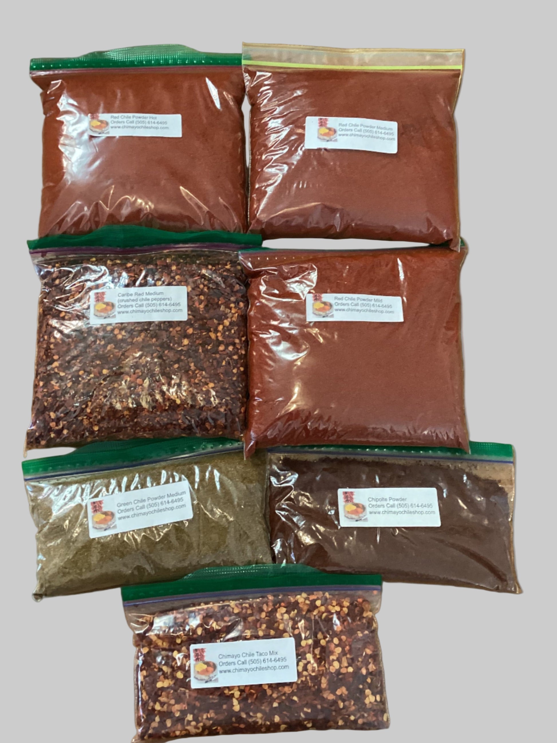 Our ultimate holiday bundle includes 7 items to include three 12 oz bags of red chile powder mild, medium and hot, one 8 oz bag of red crushed chile flakes, one 4 oz bag of green chile powder, one 3 oz bag of taco mix, and one 3 oz bag of chipotle powder.